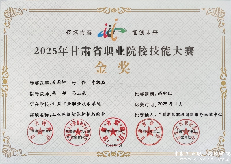 1月6日-7日,由甘肃省教育厅主办的2025年甘肃省职业院校技能大赛“工业网络智能控制与维护”赛项在兰州新区职教园区服务保障中心举行。来自全省11所兄弟院校的19支学生代表队参加了本次比赛。我校智能制造学院吴超、马玉泉两位教师指导的苏莉娜、马伟和李凯杰三位同学荣获该赛项金奖。