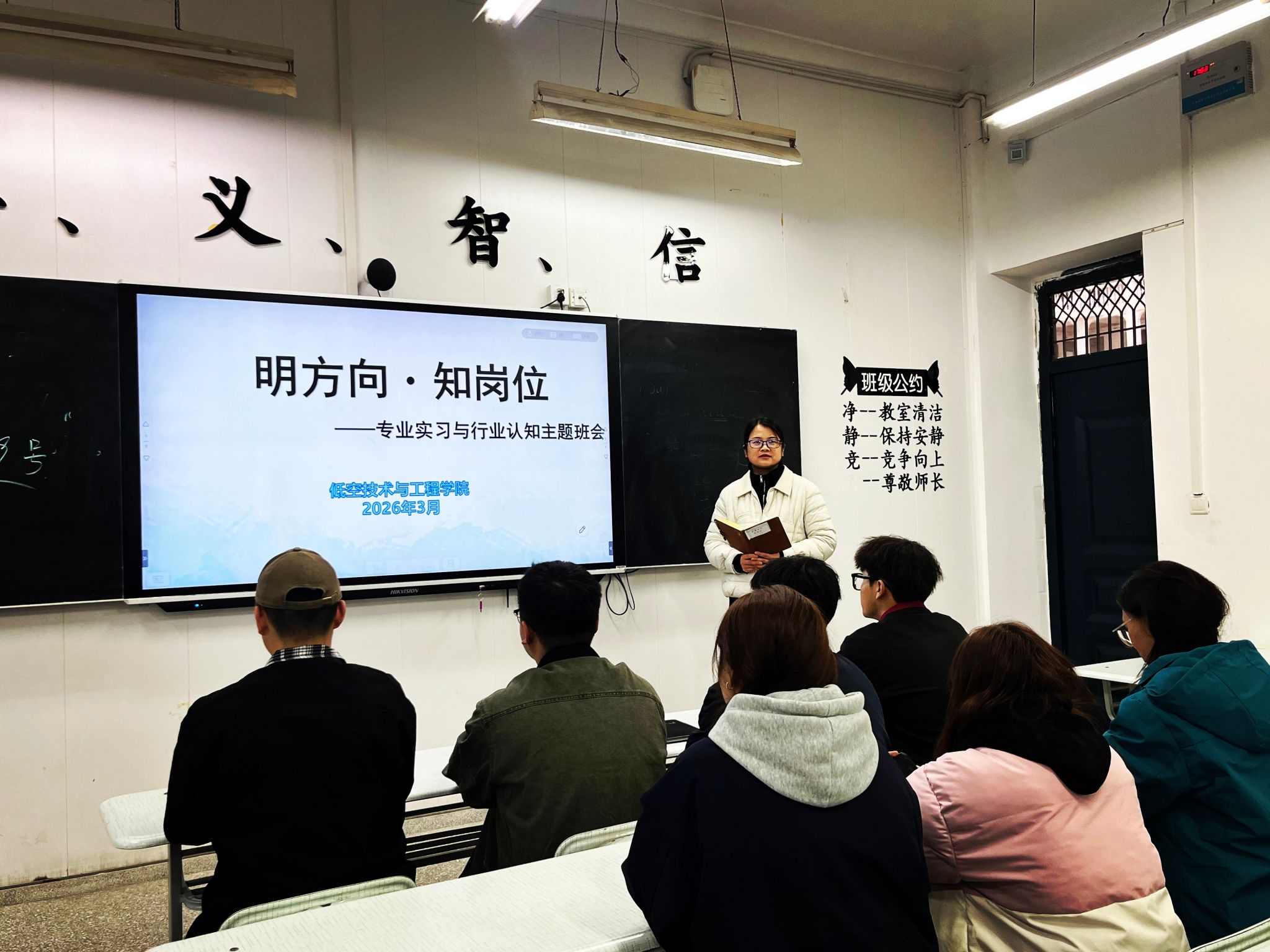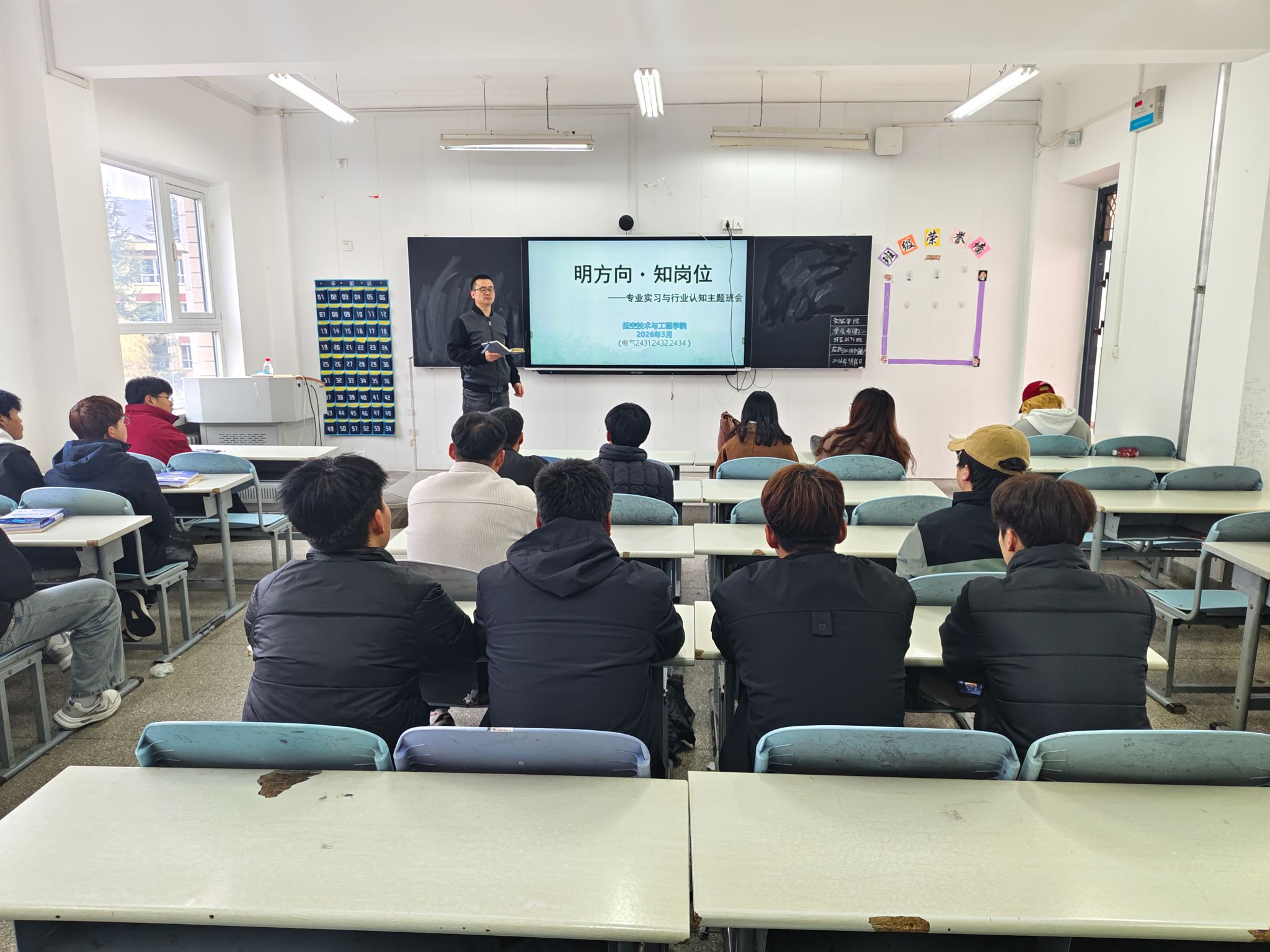 班会开篇,班主任用详实的数据、鲜活的案例,向同学们解读了相关专业的发展潜力与人才需求导向。针对学生存在“对行业不了解、对岗位不熟悉、对实习无规划”的问题,班主任帮助大家找准方向、摸清岗位、做好准备。鼓励同学们主动了解行业、熟悉岗位,提前制定科学合理的实习规划。