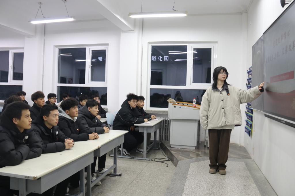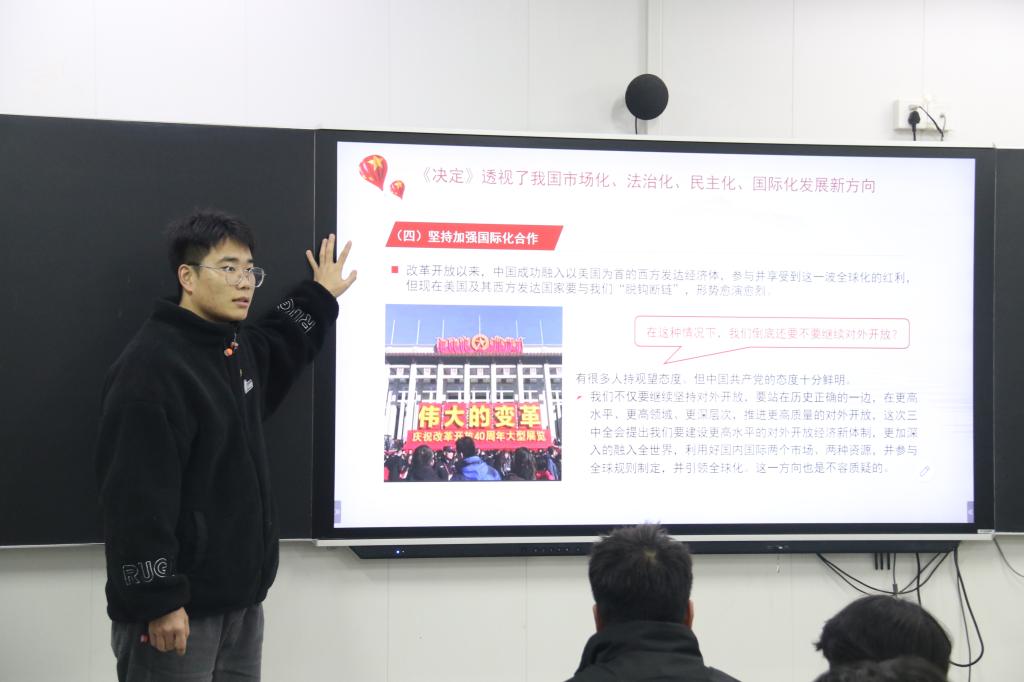 宣讲会上,青马部成员以“学习党的二十届三中全会精神”的主题进行宣讲。青马部成员深入解读了党的二十届三中全会审议通过的《关于进一步全面深化改革、推进中国式现代化的决定》,着重强调教育、科技、人才是中国式现代化的三大关键,最后,激励同学们敢打敢拼、勇担历史使命,为国家繁荣昌盛和实现中华民族伟大复兴中国梦贡献青春力量。